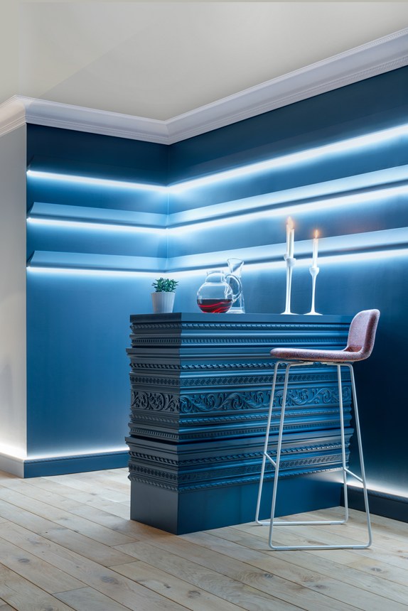 Cornici, cimase per pannellature, battiscopa e decorazioni murali da combinare con una illuminazione diretta o indiretta. Per un ambiente