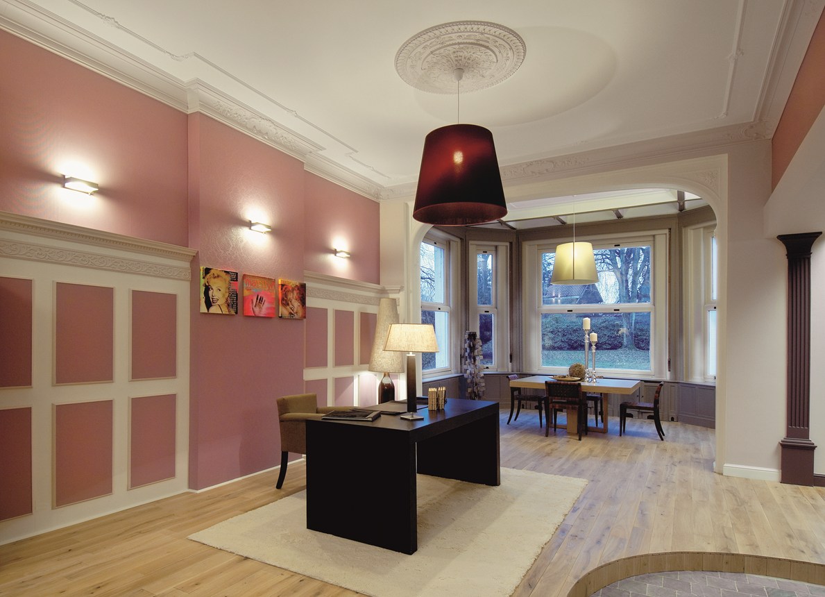 Cornici, cimase per pannellature, battiscopa e decorazioni murali da combinare con una illuminazione diretta o indiretta. Per un ambiente