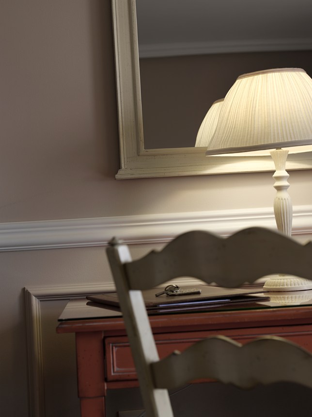 Cornici, cimase per pannellature, battiscopa e decorazioni murali da combinare con una illuminazione diretta o indiretta. Per un ambiente