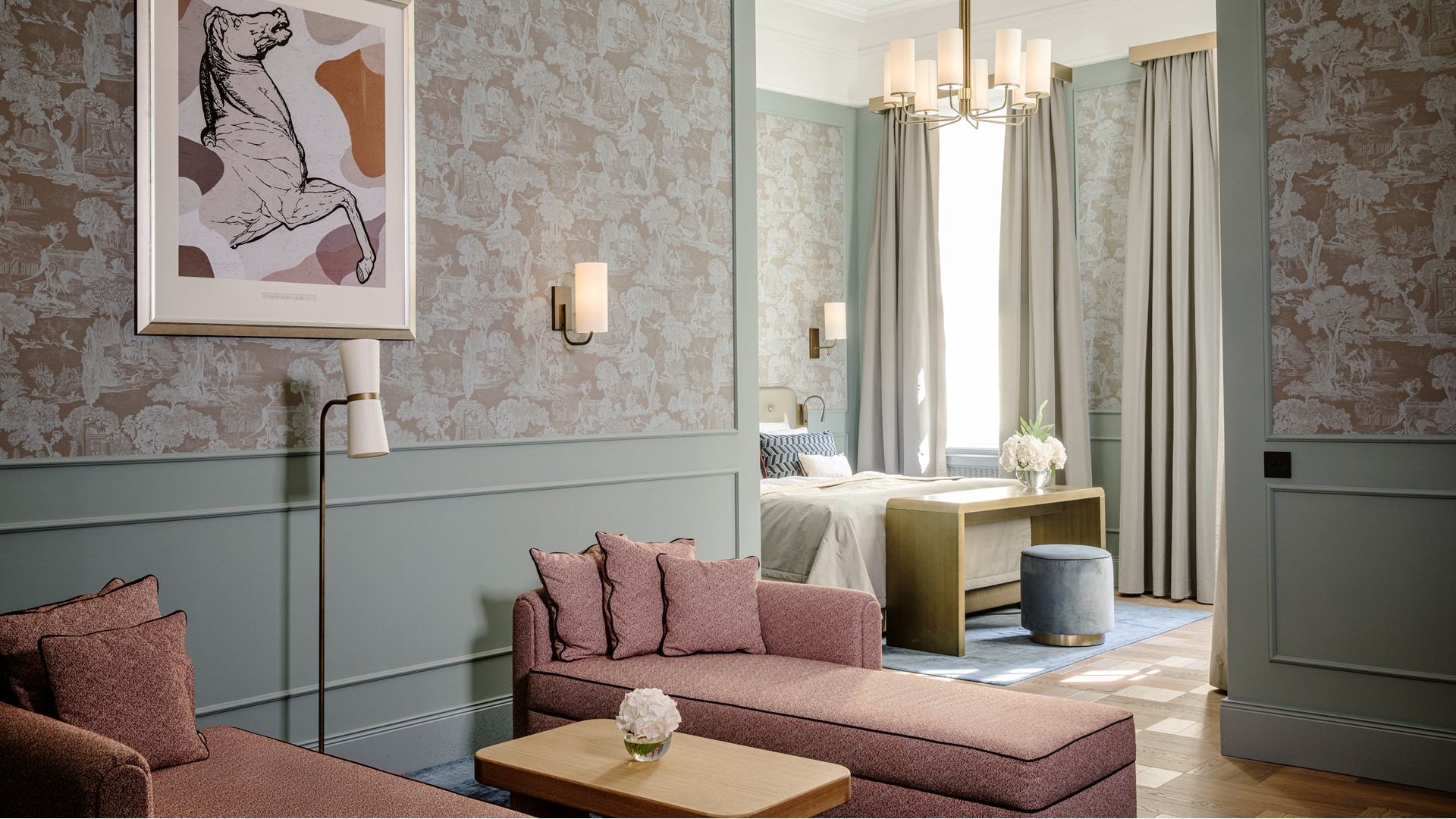 Un'accorta combinazione delle cornici da parete WL7, Z10 e Z1360, abbinate a carte da parati con motivi decorativi e tessuti di alta qualità, crea un'atmosfera suggestiva che avvolge gli ospiti in un'esperienza di comfort ed eleganza regali.